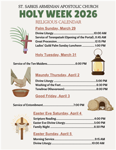 Pari Yegak! St. Sarkis Armenian Apostolic Church parish was established in 1932 in Detroit, Michigan. Our current location on Ford Road, Dearborn, MI was dedicated on October 14, 1962 and since then we have satisfied the spiritual and national needs of the Armenians in Southeastern Michigan. We are one of the Churches of the Eastern Prelacy of the Armenian Apostolic Church of America under the jurisdiction of the Holy See of Cilicia.